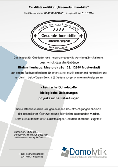 Gestaffelt nach Umfang der Untersuchungen werden folgende Qualitätsurkunden mit entsprechenden Siegeln erteilt: A => Ein Sachverständiger für Innenraumanalytik hat die Immobilie inspiziert und keine, für den Fachmann offensichtliche Schadstoffe aufgefunden bzw. aufgefundene Schadstoffe in dem beiliegenden Bericht dokumentiert. AA => Ein Sachverständiger für Innenraumanalytik hat die Immobilie inspiziert und Analysen auf chemische Schadstoffe vorgenommen oder biologische Beeinträchtigungen oder physikalische Beeinträchtigungen analysiert (1 von 3) und keine, für den Fachmann offensichtliche und zu messenden Schadstoffe aufgefunden bzw. aufgefundene Schadstoffe in dem beiliegenden Bericht dokumentiert. AAA => Ein Sachverständiger für Innenraumanalytik hat die Immobilie inspiziert und Analysen auf chemische Schadstoffe vorgenommen und/oder biologische Beeinträchtigungen und/oder physikalische Beeinträchtigungen analysiert (2 von 3) und keine, für den Fachmann offensichtliche und zu messenden Schadstoffe aufgefunden bzw. aufgefundene Schadstoffe in dem beiliegenden Bericht dokumentiert. AAAA => Ein Sachverständiger für Innenraumanalytik hat die Immobilie inspiziert und Analysen auf chemische Schadstoffe vorgenommen und biologische Beeinträchtigungen und physikalische Beeinträchtigungen analysiert (alle 3) und keine, für den Fachmann offensichtliche und zu messenden Schadstoffe aufgefunden bzw. aufgefundene Schadstoffe in dem beiliegenden Bericht dokumentiert. ![]() DomoLytik Institut für Gebäude- und Innenraumanalytik GmbH